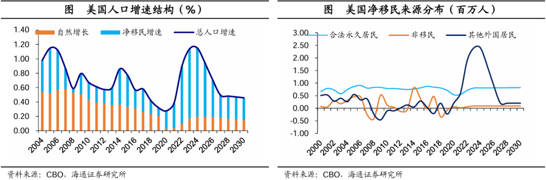 从目前现状来看,近年来,美国人口增长的主要贡献来自移民。根据CBO估计,2022年美国的净移民人数为260万人,2023年为330万人。这些值高于2010年至2019年期间(平均每年90万人)。该机构预计,2024年移民将达到330万人(此后放缓)。从人口增速来看,2020-2024年期间,净移民增长贡献了近90%的美国人口增长。