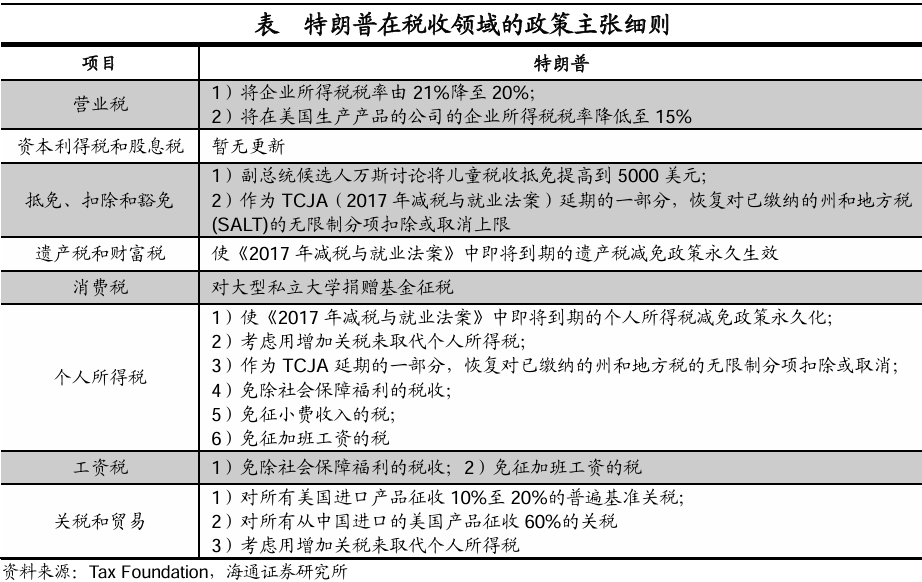海通宏观认为,特朗普的政策包一旦实施,会增加美国经济的滞胀风险,长期美债收益率或有较大的上行风险;考虑到特朗普积极支持AI并持有宽松的监管态度,或对美国科技股行情有一定支撑;美元指数或仍维持偏强的局面;黄金中长期或延续上涨行情;虚拟货币和传统能源也有所提振。
