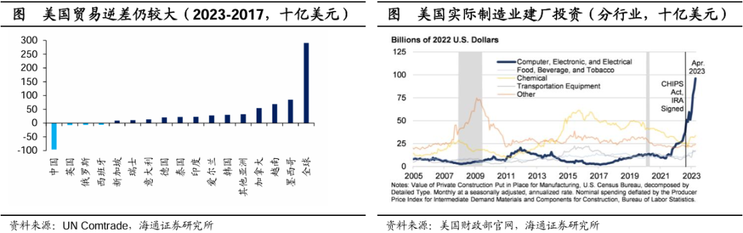 在制造业政策领域,特朗普强调将关键产业链带回美国国内,重塑美国制造业超级大国。从目前现状来看,2018年美国对中国加征关税后,贸易逆差情况也并未有效改善。截至2023年,美国贸易逆差较2017年扩大了近3000亿美元,也就意味着美国依然高度依赖外部制成品进口。