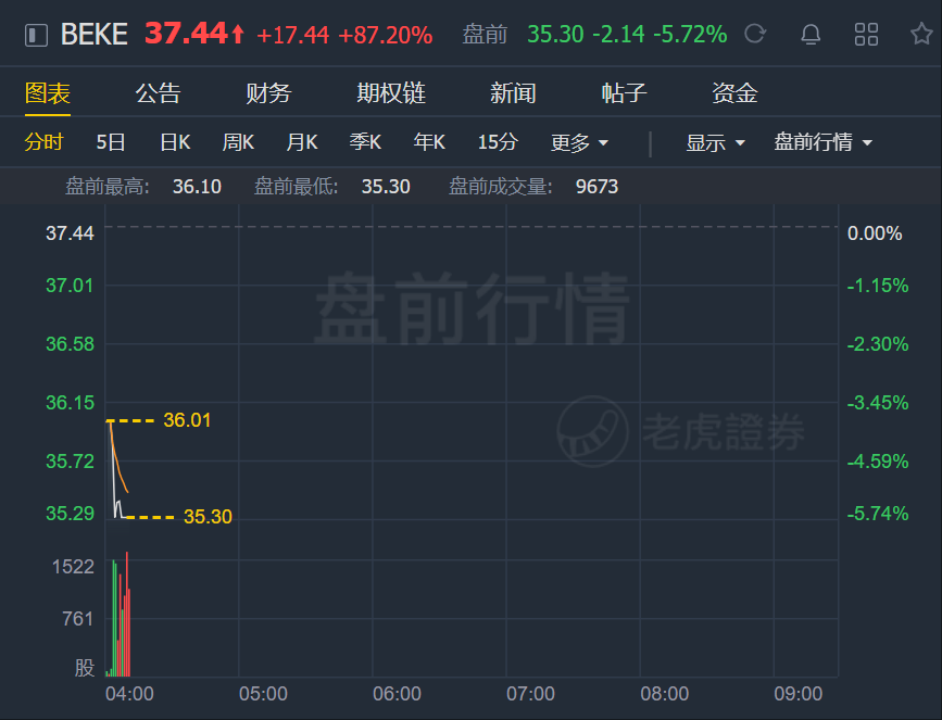 贝壳盘前跌5.7%,昨日首日上市收涨87.2%。