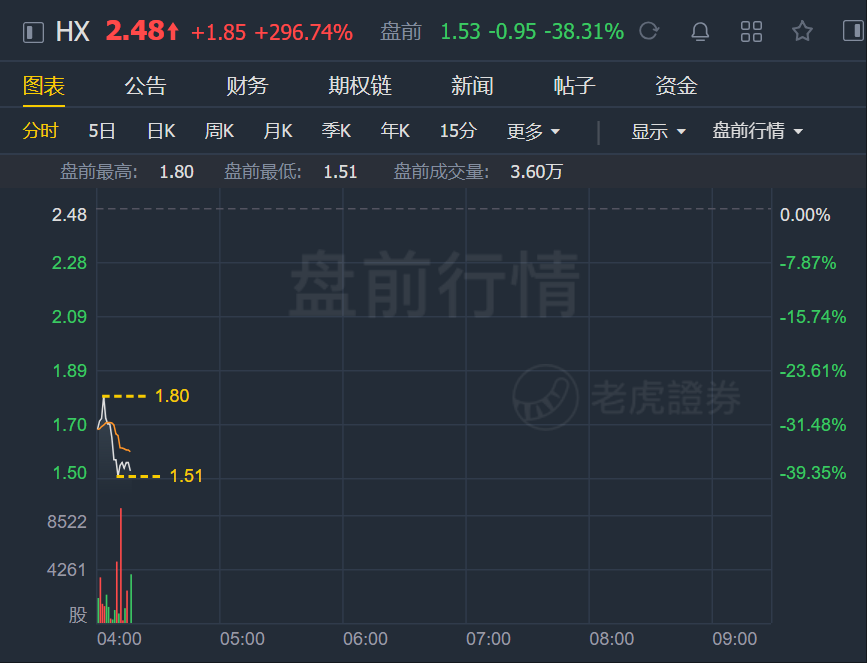 和信贷盘前跌超38%,昨日收涨近300%。早前公司宣布调整ADS比例,由1股ADS代表1股普通股调整至1股ADS代表3股普通股。