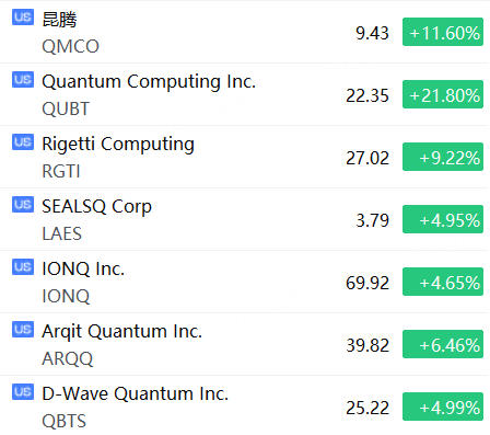 9月19日,美股量子计算概念股集体拉升,Quantum Computing涨近22%,昆腾涨超11%,Rigetti Computing涨超9%,SEALSQ Corp涨近5%,IonQ Inc涨超4%。