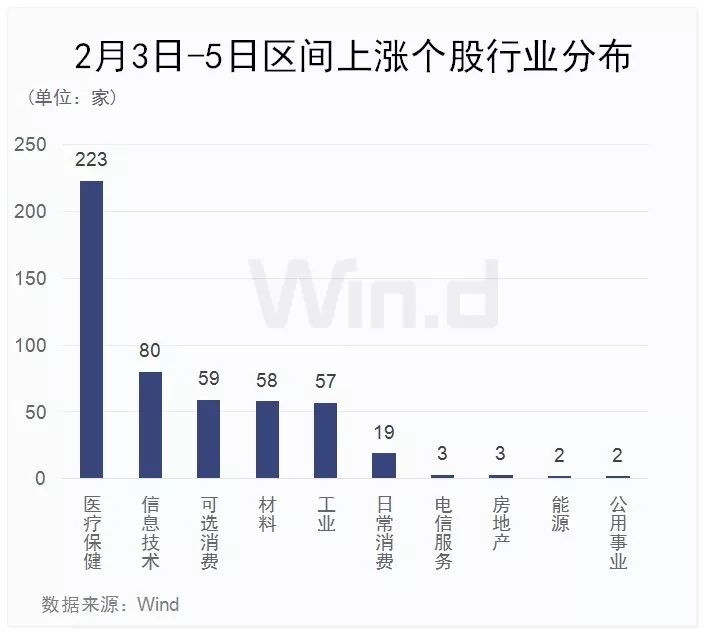 由于2月4日、5日连续两日A股大涨,虽然2月3日跌幅较大,但已有数百家公司成功收复失地。Wind统计显示,近三日,有506家公司累计上涨,从相关公司行业分布来看,医疗保健当仁不让位居首位,有223家公司;信息技术亦有80家公司;可选消费、材料、工业均有50多家公司。
