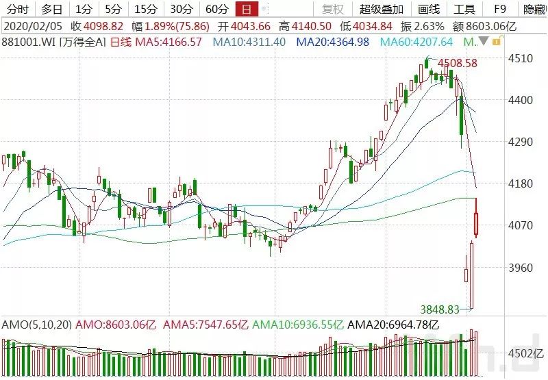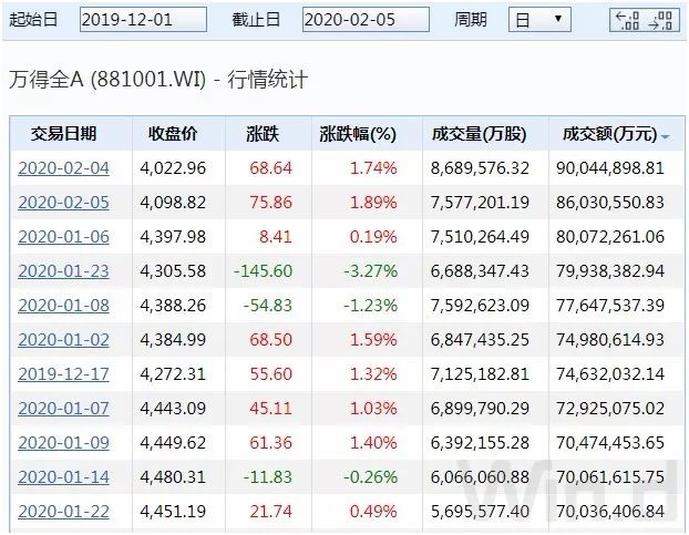 成交额是衡量走势的一个重要指标,去年12月以来,A股放量拉升,连续多个交易日维持在6000亿元-7000亿元的水平,量价配合完美。鼠年首个交易日,因疫情影响,A股跳空大跌,但随后两个交易日,资金大举进场扫货,2月4日,万得全A成交金额突破9000亿元,创去年12月以来新高,2月5日,万得全A成交金额达8600多亿元,紧随其后。连续两日放量拉升,可见抄底资金来势汹汹。