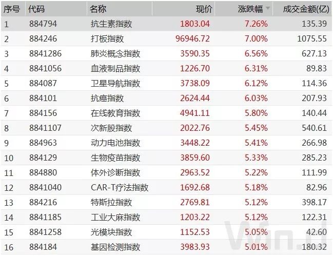 巨量成交下,市场热点纷呈,Wind概念板块中,抗生素、肺炎、卫星导航、在线教育等10多个板块涨幅超过5%。