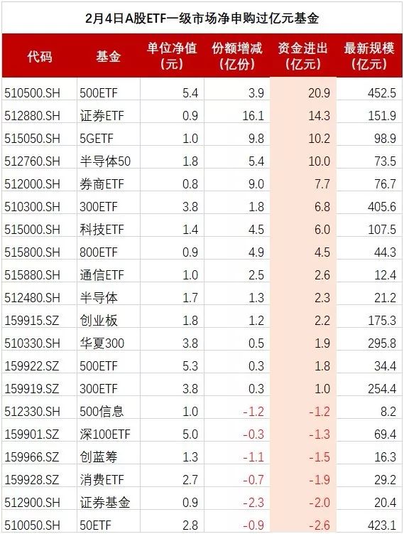 Wind数据显示,2月4日,市场上A股ETF共212只,当日份额净增加46.19亿份,乘以相应基金当日单位净值,以此估算A股ETF一级市场获得70.22亿元净申购。其中净申购过亿元的基金有14只,500ETF、证券ETF、5GETF、半导体50净申购超10亿元。另外有6只A股ETF净赎回过亿元,其中50ETF净赎回2.6亿元。