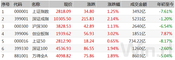 截至2月5日收盘,上证综指涨1.25%报收于2818.09点;深成指涨2.14%报收于10305.50点;创业板指涨3.02%报收于1939.62点,万得全A总成交逾8600亿元,维持近日高位。