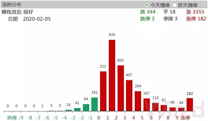 截至2月5日收盘,沪深两市大幅上涨,从个股表现来看,因信心修复,也迎来普涨行情,上涨个股有3300多家,涨停股达182家。下跌个股仅有300多家。从涨幅分布来看,涨幅超过2%的近2000家,投资者情绪高涨。