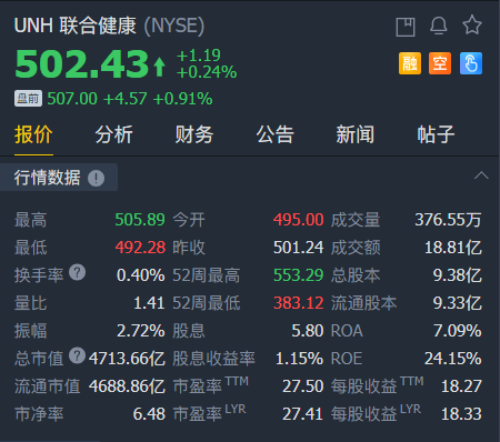 截至发稿,联合健康盘前涨近1%。