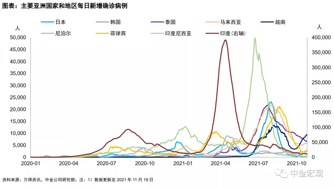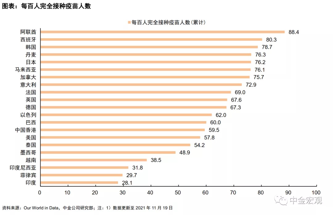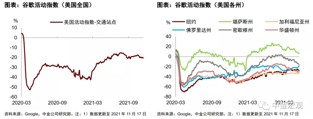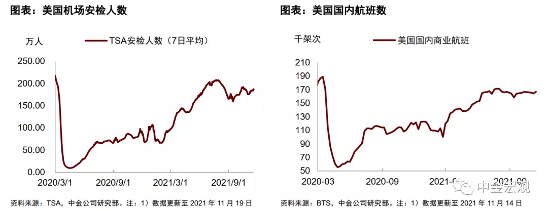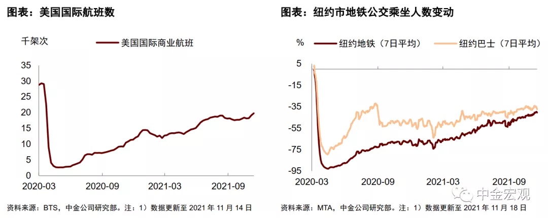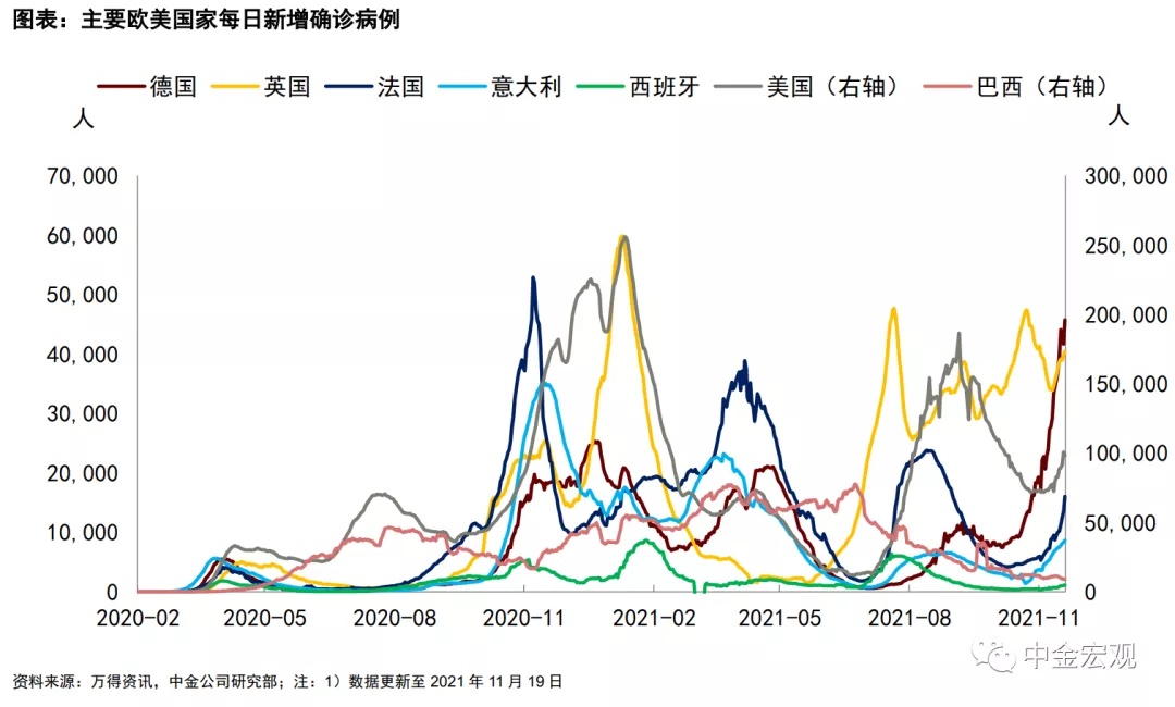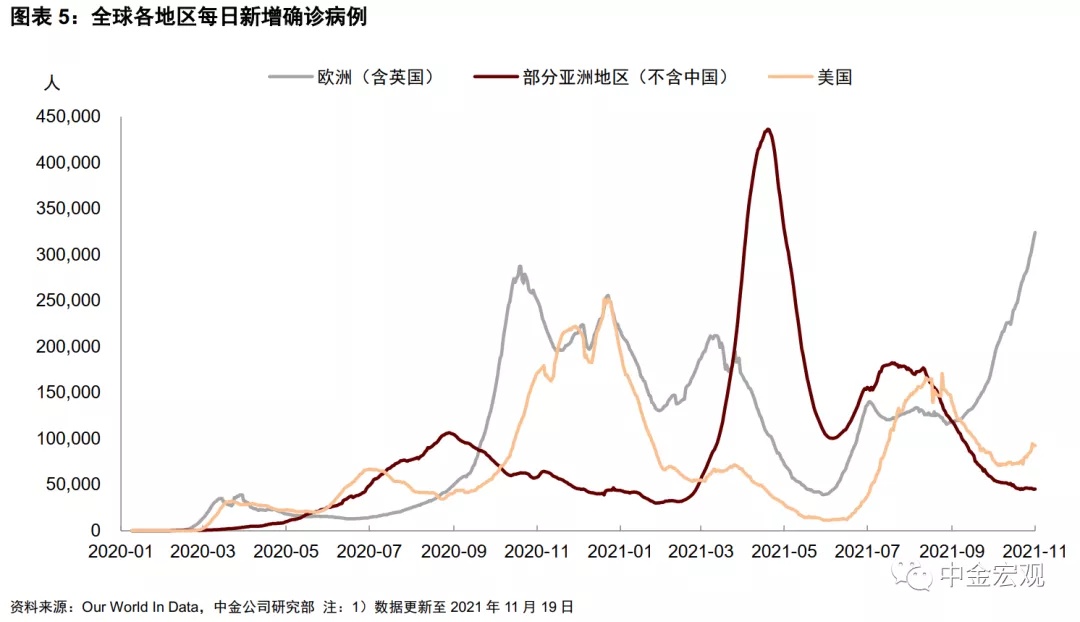 5)欧洲疫情再度反弹,全球冬季疫情走势存在不确定性,央行对加息或将更加谨慎。在气温降低、管控放松以及疫苗接种迟缓等多重因素影响下,欧洲多国疫情出现快速反弹,美国疫情也有小幅抬头的趋势。目前欧洲新一波疫情主要集中在俄罗斯、德国以及部分东欧国家,这些国家的新增病例与ICU人数均有所上升。为应对疫情,奥地利宣布从11月22日起施行全国性封锁。封锁期间,除工作和购买必需品及锻炼外,奥地利全国国民都不得离开居所。德国也宣布进入国家紧急状态,并对未接种疫苗的人群加以更严格的限制,斯洛伐克、捷克、荷兰在此前也针对防疫宣布了程度不同的新增限制措施。由于美国11月初解除了针对欧洲访客的旅行禁令,在欧美通航无阻的情况下,不排除欧洲疫情向美国扩散的可能。在冬季疫情仍有较大不确定性的背景下,我们预计美联储在加息议题上难以做到很激进。