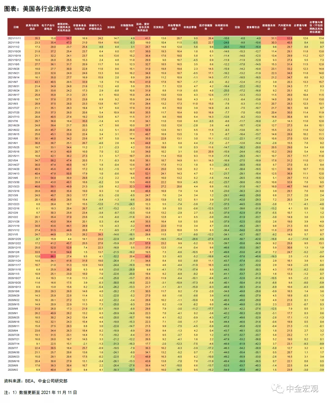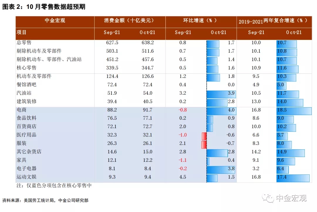 1)美国10月通胀与零售销售超预期,关于货币政策是否要提前收紧再引争论。10月美国CPI同比增速达到6.2%,为1990年以来最高水平。正如我们在报告《美国通胀“破6”意味着什么?》中所讲,通胀“破6”是一个不可忽视的信号,它已经高过了很多人的“心理防线”,对居民实际收入、消费者信心、以及执政者的支持率都会带来不利影响。高通胀还会使得美联储进入进退两难的“窘境”,货币政策不确定性将会上升。另一方面,尽管消费者信心不振,美国零售数据仍然坚挺,10月零售销售环比增长1.7%,高于前值0.7%,不包括汽车、餐馆酒吧、汽油、建筑装修在内的核心零售也增长了1.6%。这也是美国零售数据连续第三个月呈现增长态势。不可否认,零售数据较好部分是因为涨价因素,但无论是价格还是数量上升,都将增加美联储退出货币宽松的压力。