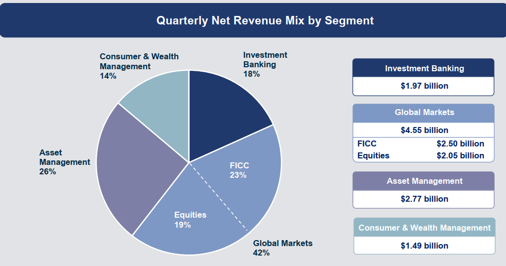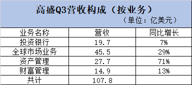 此外,与信贷利差相关的利息收入占比较小也是一个原因。财报显示,三季度高盛利息收入10.84亿美元,与之相对的非利息收入为96.97亿美元。