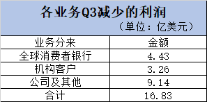 富国银行的情况基本类似,三季度富国银行的利息收入同比减少23亿美元,至94亿美元;非利息收入同比减少8.91亿美元至95亿美元。