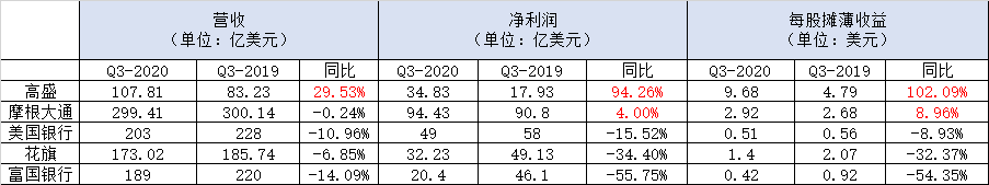 本周,花旗、摩根大通、高盛、美国银行以及富国银行先后发布了三季度财务报告。在经历了二季度大幅下滑之后,三季度银行的业绩迎来复苏。此外,五家银行展现出的一个明显的特征是,交易业务见长的高盛表现更为优异,而利息收入占总收入半壁江山的美国银行和富国银行表现不佳。