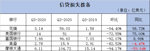 - 花旗、美国银行三季度信贷损失拨备,较去年同期大幅增长。其中,花旗信贷损失拨备3.14亿元,同比增长约99%;美国银行14亿元,同比增长75%。