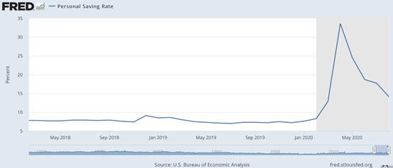 同时,企业为防范风险而借入资金的需求以及投资者转向高质量和规避风险的资产配置也推升了存款。疫情开始后,美国居民储蓄率直线上升(现已回落)。