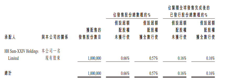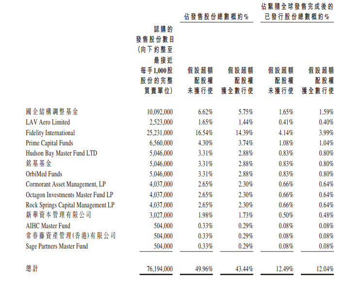 此外,根据国际发售,除向中国国有企业结构调整基金股份有限公司(为现有股东永禄控股有限公司的紧密联系人)及LAV Aero Limited(现有股东)(作为全球发售的基石投资者)配售若干发售股份外,合共向HH Sum-XXIV Holdings Limited(现有股东)配发100万股发售股份。