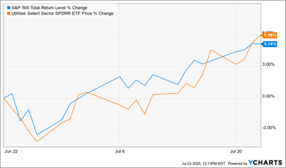 盖伊德还补充说,历来被视为与衰退绝缘的安全投资避风港公用事业板块,其当下的表现也意味着大盘要遇到麻烦了。在下图当中,可以明确地看到这些防御性投资的表现在最近一个月时间当中是如何超越了大盘的。