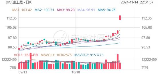 迪士尼涨近10%,为自2月份以来的最大涨幅。第四财季营收、调整后每股收益均超预期,上调业绩展望,计划回购30亿美元股票。