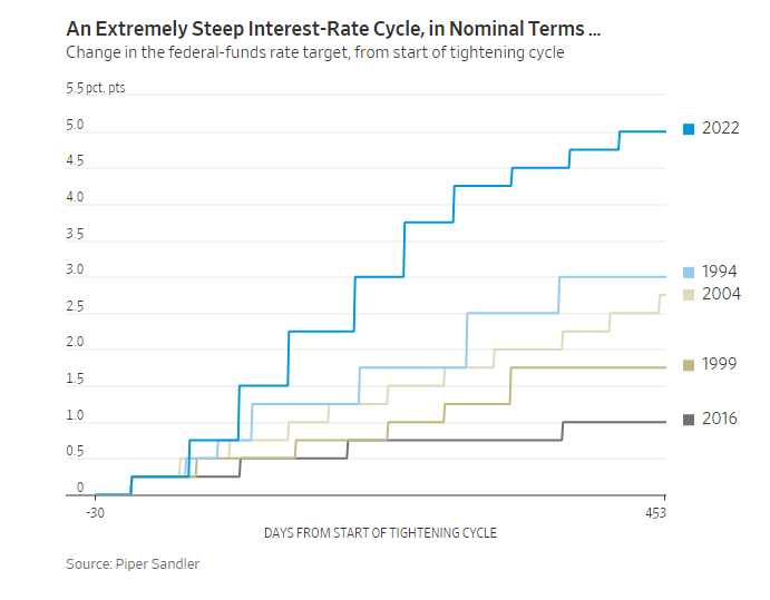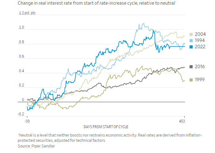但对经济有影响的是实际利率(经通胀调整),而不是名义利率。由于通胀高于前几个周期,实际利率的上升幅度要小得多。