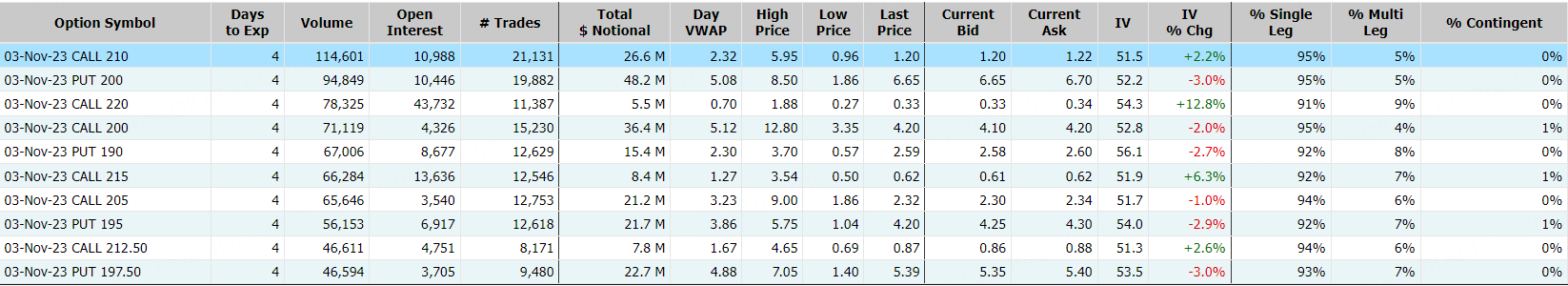 特斯拉隔夜收跌4.79%,股价跌破200美元,创5月底以来最低收盘价!该股期权合约成交242.2万张。11月3日到期的210美元的行权看涨期权交易量特别高,共有114,601份合约交易。