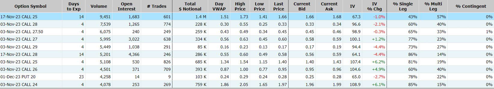 Pinterest期权合约成交16.12万张,较90日平均成交量扩大3.6倍。11月17日到期的25美元的行权看涨期权交易量特别高,共有9,451份合约交易。