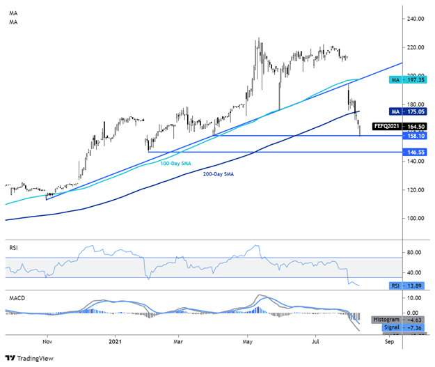 Iron ore prices have seen a sharp drop over the last few weeks, with a slice through the 100- and 200-day Simple Moving Averages (SMAs). A trendline from October was also breached with ease. Prices are over 20% lower since June, and the 2021 yearly gain is in danger of being wiped out. The April low at 158.10 appears to be providing a layer of support. Below that, the 2021 low at 146.55 may be endangered. Bulls may need to recapture the 200-day SMA to regain a solid footing to push higher.
