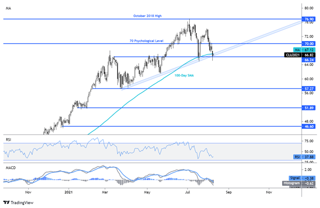 Crude oil’s technical posture has weakened substantially since reaching a multi-year high at 76.98 back in late July. Since then, prices have dropped over 10%. The 100-day Simple Moving Average (SMA) has also been breached this week. However, a trendline formed from the March low appears to be underpinning further losses. If prices pierce below the trendline, an extension lower may be likely. Alternatively, holding the trendline may see the preceding trend higher continue.