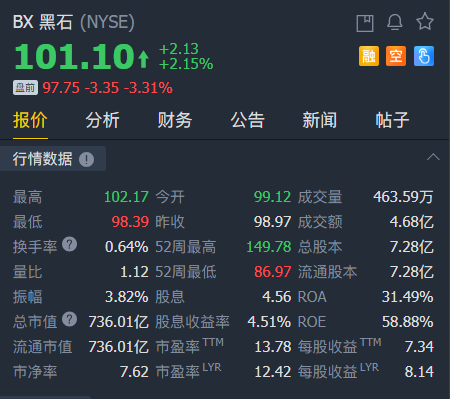 截至发稿,黑石盘前跌超3%。