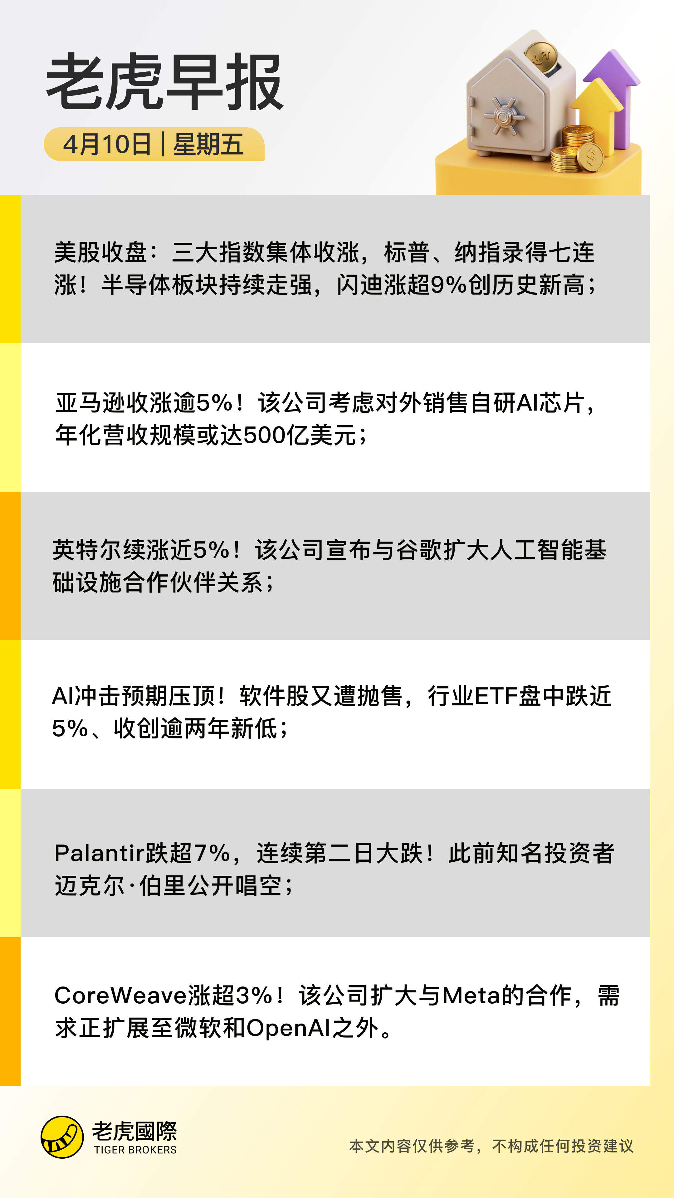 热门股异动:芯片及“科技七巨头”表现突出,亚马逊涨5.60%,因对外销售自研芯片计划提振情绪;闪迪涨9.05%再创高位,受DRAM供需紧张预期推动;英特尔涨4.70%携手谷歌推进AI基础设施;美光科技涨3.63%,英伟达涨1.01%;相对而言,Palantir跌7.30%,SaaS 板块受AI智能体竞争冲击走弱。