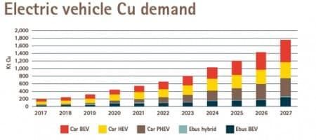 The International Copper Association estimates that the rapid rise of EVs will raise copper demand in EVs from 185,000 tonnes in 2017 to 1.74 million tonnes by 2027.