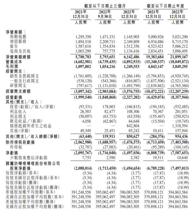 第四季度移动游戏营业额为人民币11亿元,较2021年同期减少12%,主要是由于2022年第四季度缺少新推出游戏所致。