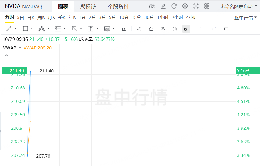 10月29日,英伟达盘初高开高走,涨幅扩大至5%,总市值达到5.14万亿美元。