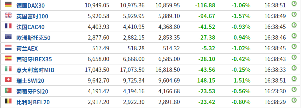 欧洲主要指数集体下跌,欧洲斯托克50指数跌0.94%,英国富时100指数跌1.57%,德国DAX30指数跌1.06%。