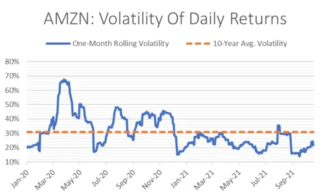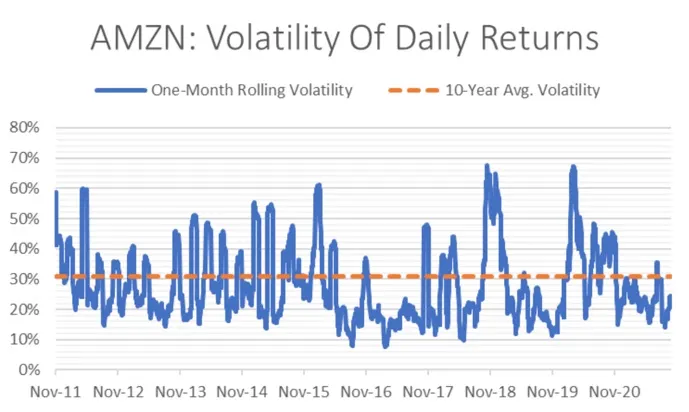 The graph below shows that, on average over the past decade (see dotted orange line), the volatility in Amazon’s daily returns has been about 31% annualized. As a reminder, volatility is a traditional measure of risk that informs how much a stock tends to “bounce around” from period to period (day to day, in this case, but in annualized terms).