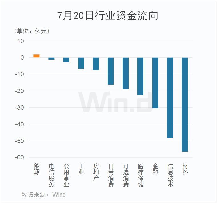 从7月20日行业资金流向来看,主力资金净流出200多亿元,其中材料板块净流出超过50亿元,位居首位;信息技术板块净流出额超过40亿元,紧随其后;金融、医疗保健、可选消费板块净流出金额亦较多。仅能源板块微幅净流入。