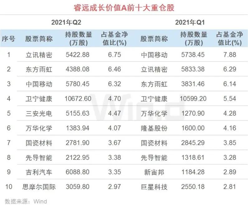 睿远基金知名经理傅鹏博管理的睿远成长价值中,立讯精密、东方雨虹、中国移动继续占据睿远成长价值前三大重仓股位置,只是立讯精密取代中国移动成为睿远成长价值头号重仓股。新进前十大的是三安光电、吉利汽车、思摩尔国际。
