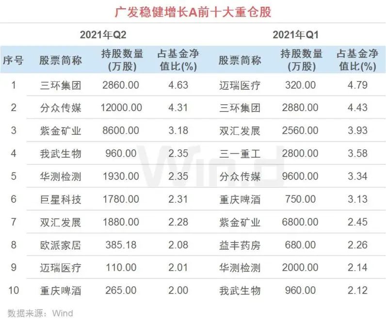 傅友兴管理的广发稳健增长中,二季度增持紫金矿业,新进前十大的是巨星科技和欧派家居;其中三环集团持仓占比4.63%,为该基金第一大重仓股;三一重工,益丰药房等退出前十大重仓股。