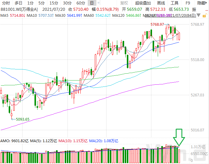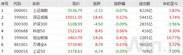 截至7月20日收盘,上证指数跌0.07%报收于3536.79点;深成指涨0.12%报收于15011.35点;创业板指涨0.41%报收于3463.79点,万得全A总成交9602亿元。