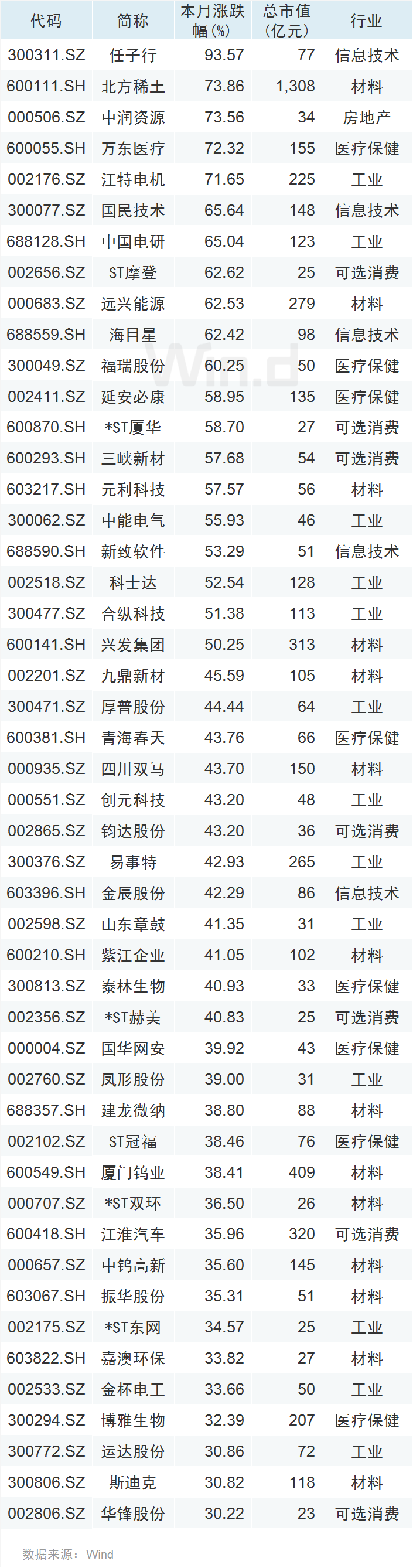 虽然7月以来市场大幅震荡,但并不妨碍个股的精彩表现。Wind统计显示,有125只个股7月20日盘中最高价创今年以来新高,其中本月涨幅超过30%的个股有48只。网络安全龙头公司任子行本月涨幅超过90%,位居涨幅榜首位,此外,北方稀土、中润资源、万东医疗、江特电机、国民技术、中国电研、ST摩登、远兴能源、海目星、福瑞股份等公司涨幅均超过60%。
