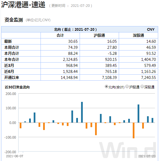 7月20日,北上资金净流入30.65亿元,连续两天净买入。值得注意的是,最近两天市场多数时间处在低位运行,北上资金小幅净买入,或存在试探性加仓的动机。