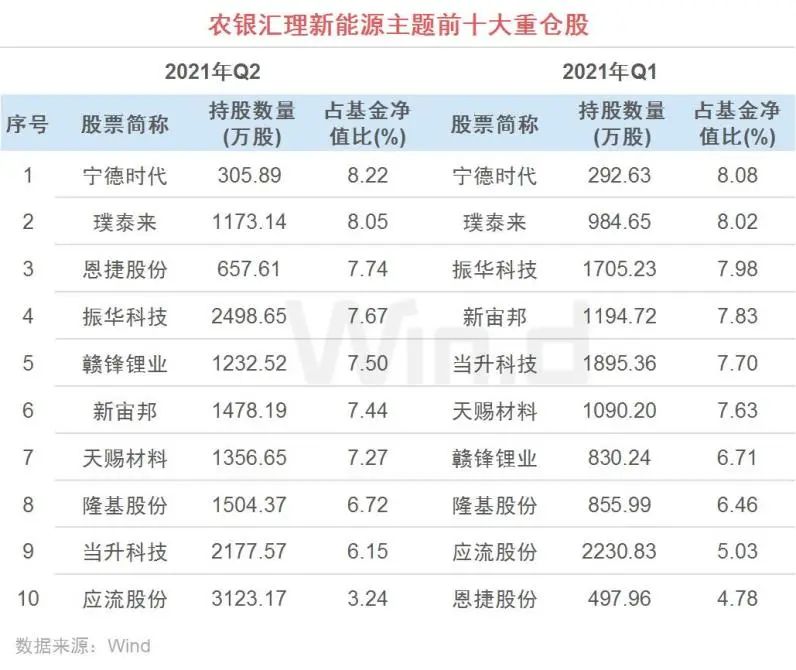 赵诣管理的农银汇理新能源主题基金中,前十大重仓股名单没有变化,只是排名座次发生了变化,其中宁德时代、璞泰来仍然是第一和第二大重仓股,恩捷股份取代振华科技成为第三大重仓股。