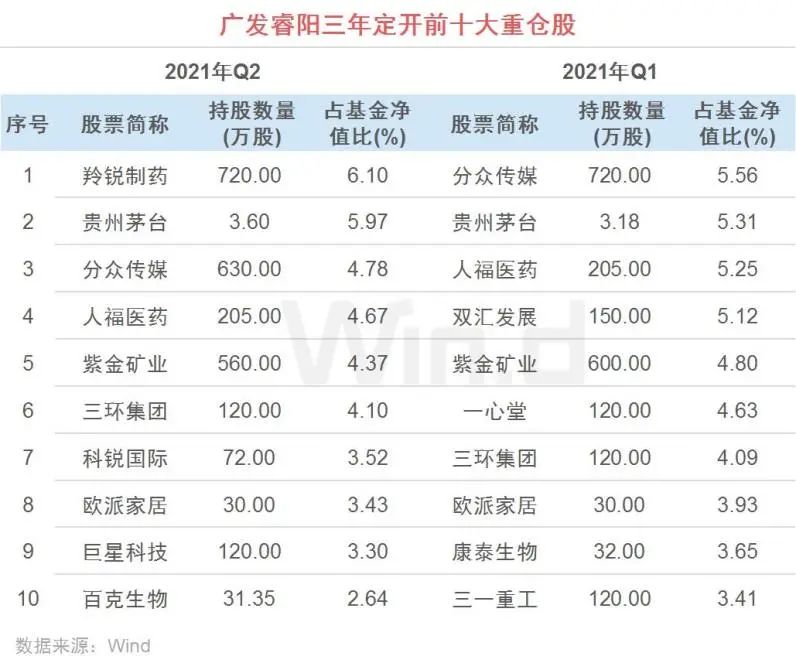 傅友兴另一只基金广发睿阳三年定开,二季度新进了羚锐制药,持股市值占基金净值比达6.1%,为该基金第一大重仓股,分众传媒被小幅减持,双汇发展、一心堂、康泰生物和三一重工则退出前十大重仓股名单。
