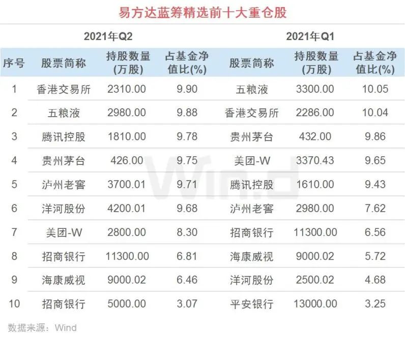 张坤管理的易方达蓝筹精选中,平安银行淡出前十大,新进前十大的是爱尔眼科。二季度张坤增持腾讯控股200万股,持仓市值占基金净值比从9.43%上升至9.78%,跃升至第三大重仓股。