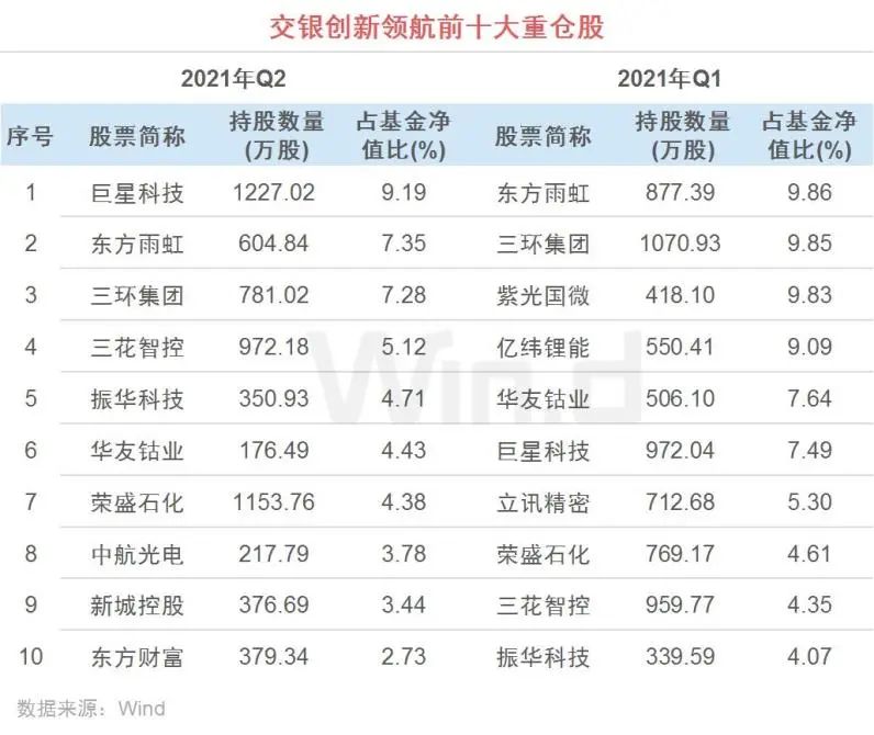 郭斐管理的交银创新领航混合中,巨星科技取代东方雨虹成为第一大重仓股,持仓数量较今年一季度末增加254.98万股。