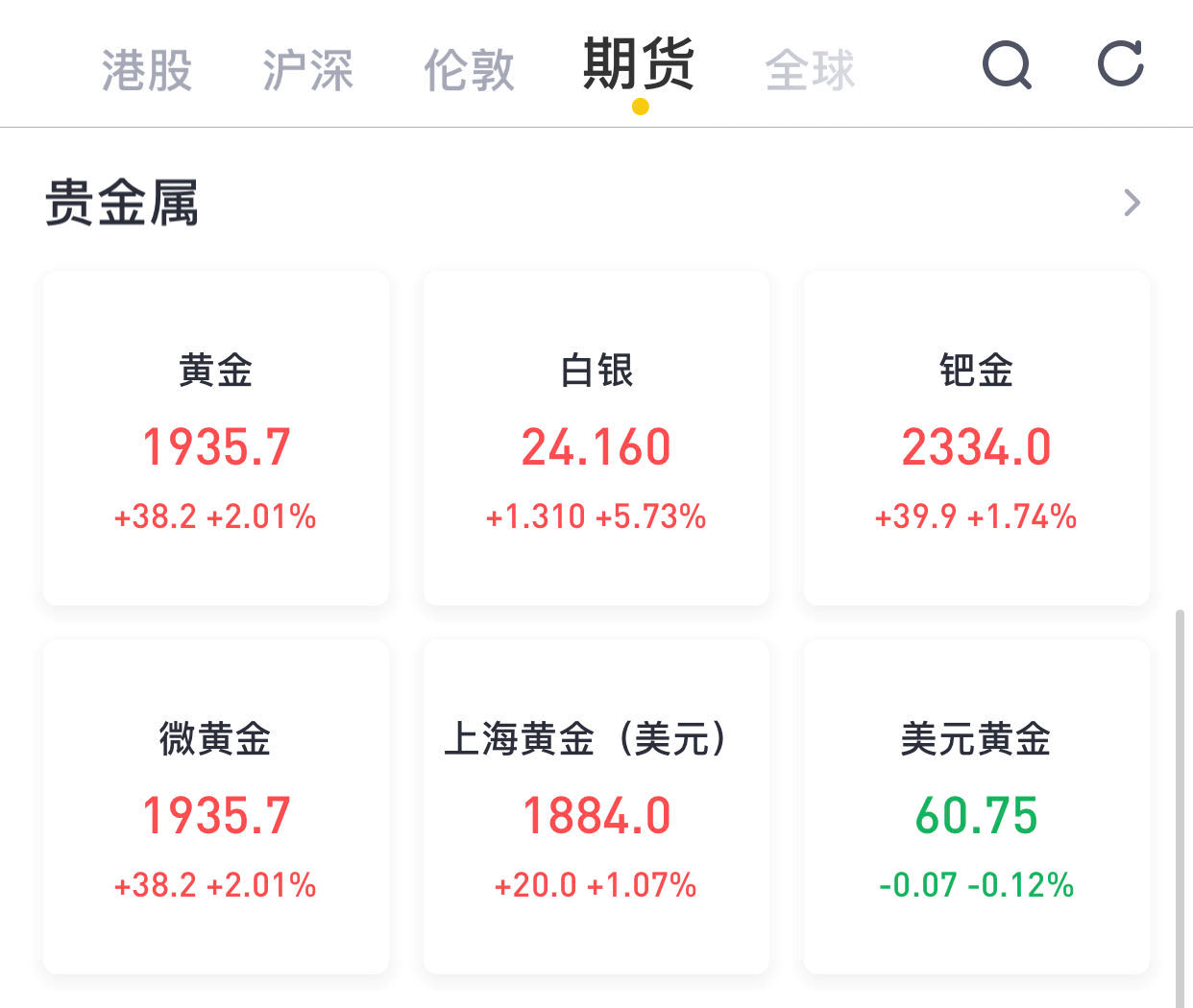截至发稿,黄金8月合约日内涨2.01%,报1935.7美元/盎司;白银9月合约日内涨5.73%,报24.16美元/盎司。