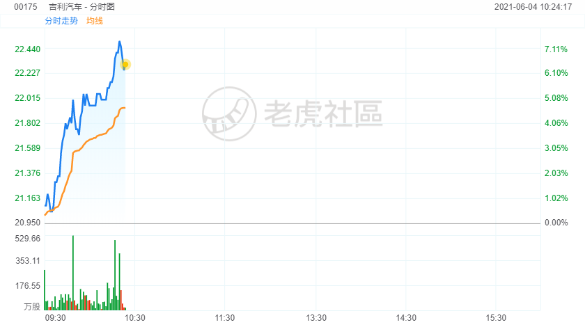 6月4日,吉利汽车经过昨日调整后,今日重新走强,盘中逆势涨超7%报22.45港元,创4月21日以来新高;该股自5月14日最低位反弹至今,累涨30%。