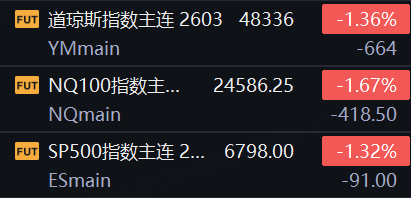 3月2日,美股三大股指期货集体走低,截止发稿,道指期货跌1.36%,纳指期货跌1.67%,标普500指数期货跌1.32%。