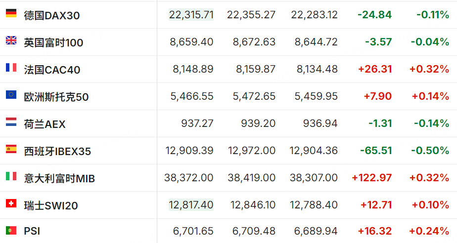 欧洲主要股指开盘涨跌不一,截至发稿德国DAX30指数跌0.11%,英国富时100指数跌0.04%,法国CAC40指数涨0.32%,欧洲斯托克50指数涨0.14%。