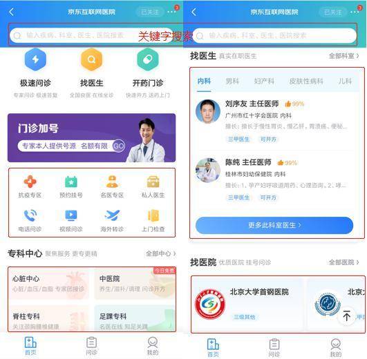 用户体验在线医疗服务,需要在京东APP的首页上,搜索京东互联网医院,即可进入在线医疗服务场景。平台提供了包括问诊、处方续签、慢性病管理和家庭医生服务。外部医生可以选择向患者收取平台建议的标准费用,也可以自行决定收取费用。京东健康根据医生收取的费用向医生收取手续费。